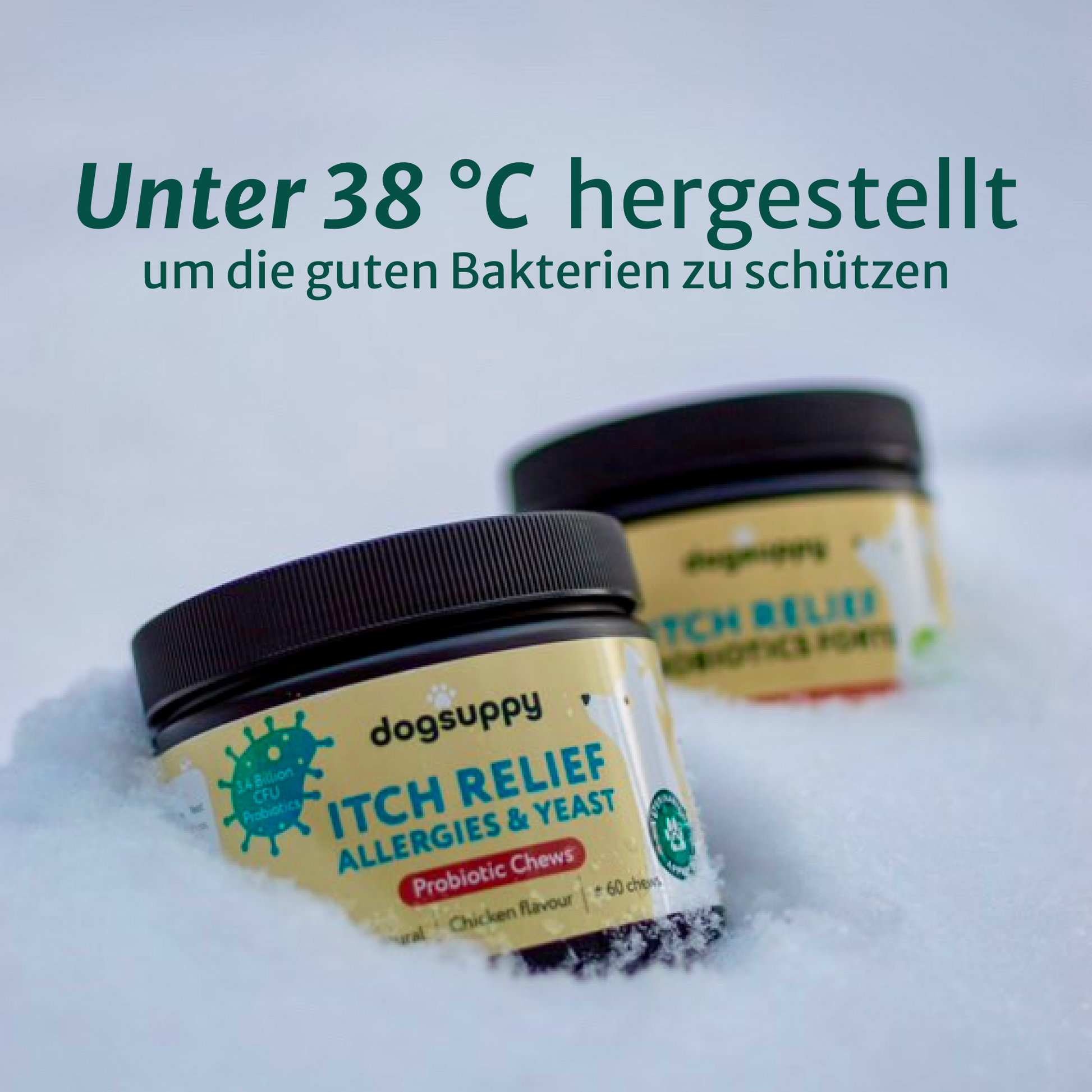 Wir priorisieren Qualität vor Effizienz. Im Gegensatz zu den meisten Marken werden unsere Itch Relief Probiotic Chews bei Temperaturen unter 38°C hergestellt. So stellen wir sicher, dass 99 % der nützlichen Bakterien überleben und wirksam bleiben. Das bedeutet, dass mehr Probiotika den Darm deines Hundes erreichen und echte Linderung von innen heraus bieten.