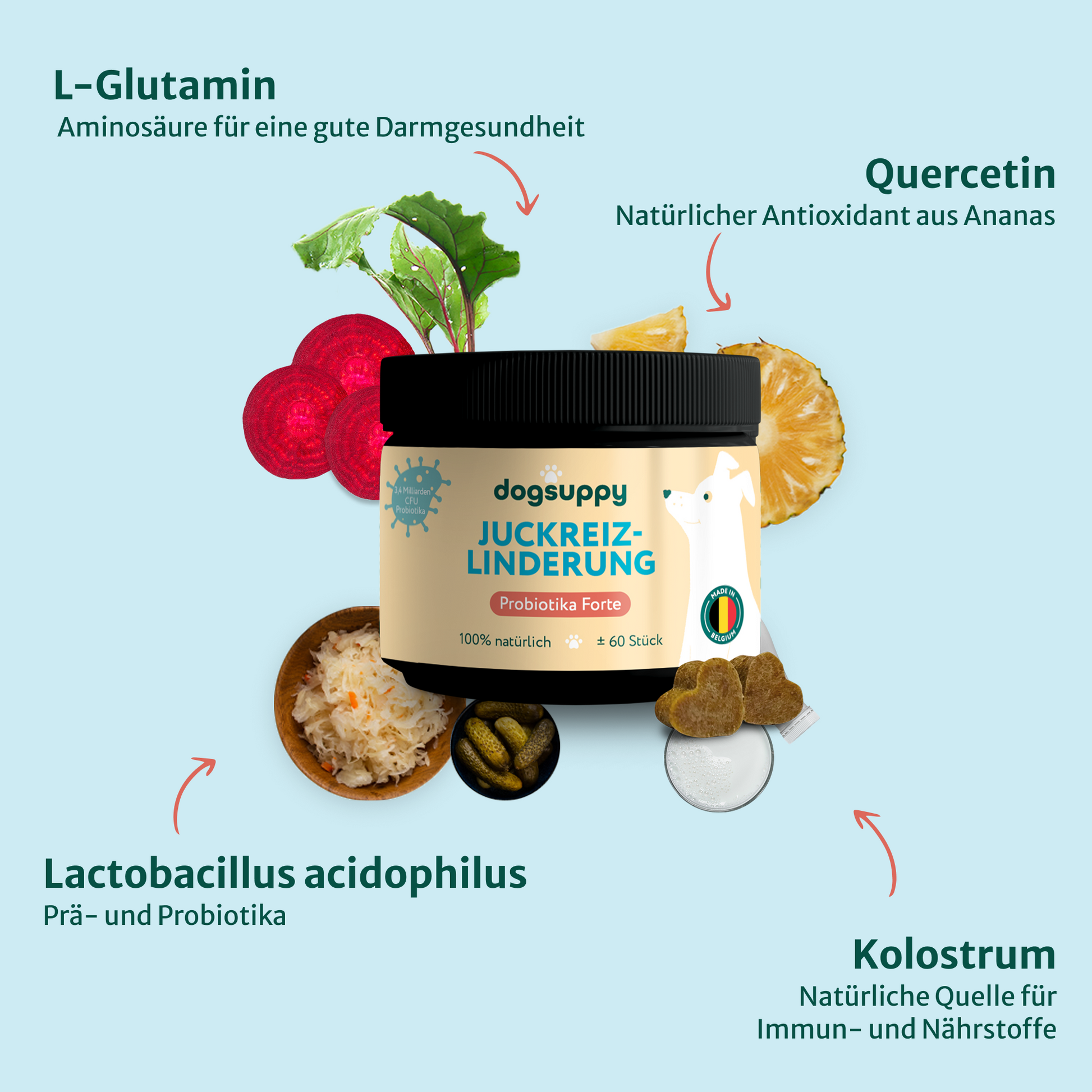 Hauptinhaltsstoffe: Präbiotika, Probiotika, Quercetin, Kolostrum, L-Glutamin.