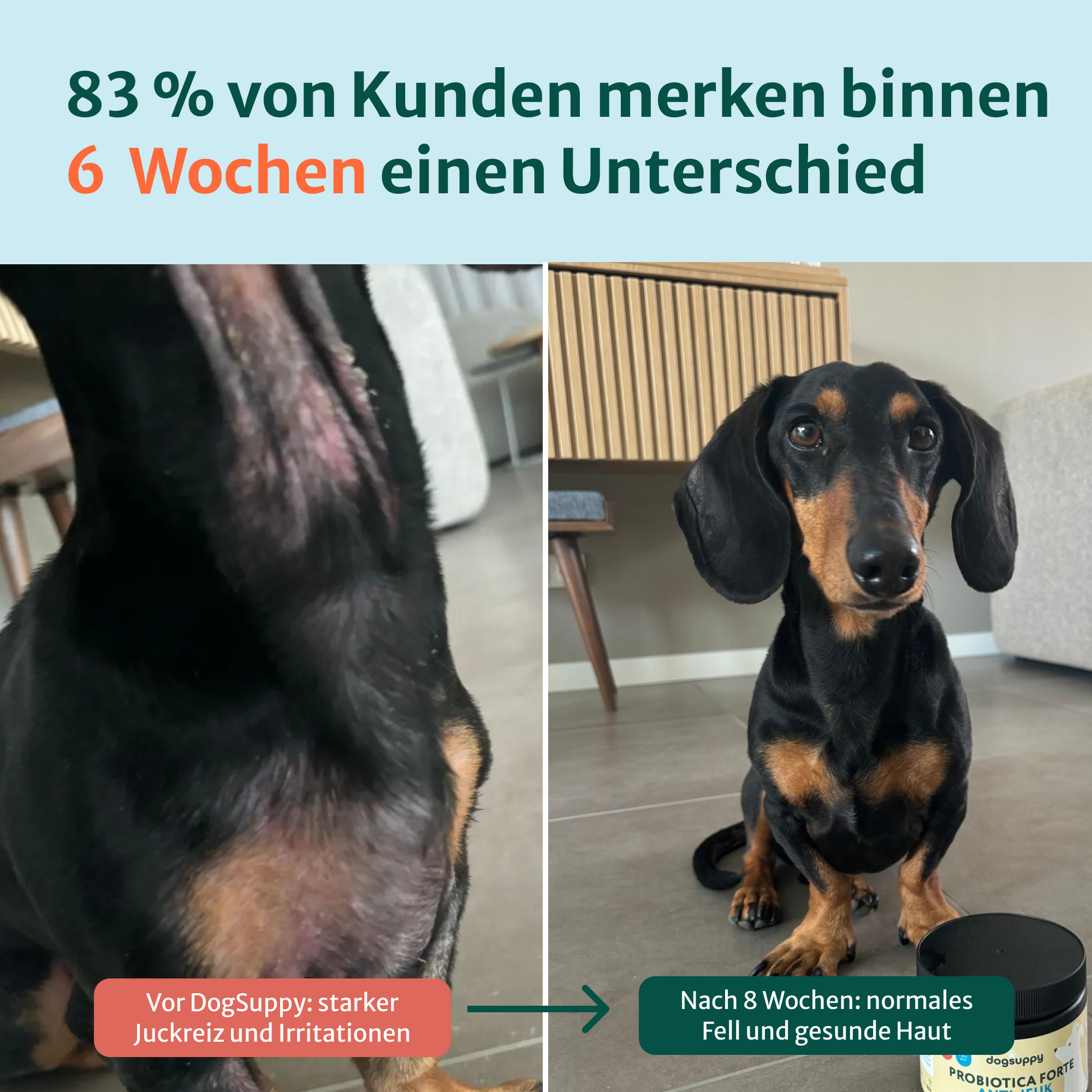 83 % unserer Kunden sehen positive Effekte innerhalb von 6 Wochen, wobei es bei einigen etwas länger dauern kann - bis zu 8 Wochen. Die Probiotika und natürlichen Wirkstoffe setzen an der Wurzel von Problemen wie Kratzen, Pfotenlecken, Hefepilzinfektionen und übermäßigem Grasfressen an - deshalb kann es einige Zeit dauern, bis Ergebnisse sichtbar werden. Wie lange es dauert, hängt in erster Linie von der Darmgesundheit deines Hundes ab. Aus diesem Grund bieten wir eine 60-Tage-Geld-zurück-Garantie auf deine erste Bestellung an, damit du genügend Zeit hast, die Vorteile selbst zu erleben.